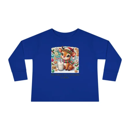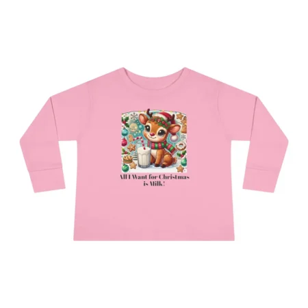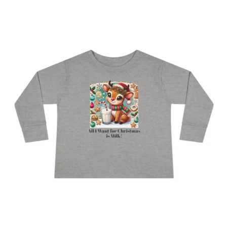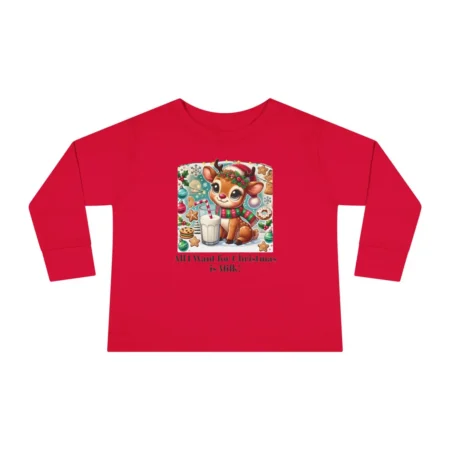 This Toddler Long Sleeve Tee features the phrase ‘All I want for Christmas is Milk’, making it the perfect Holiday Kids Tshirt for the festive season. Personalizable and comfortable, this tee is a must-have for toddlers during Christmas celebrations. It gives a cozy and festive vibe, perfect for young children who love the holiday spirit.