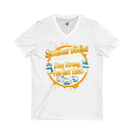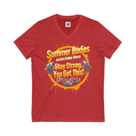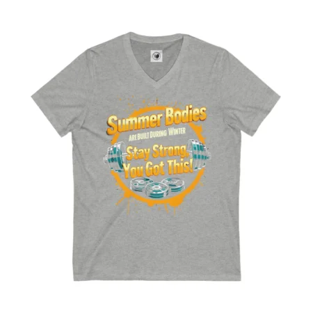 Stay motivated and energized with this Unisex Short Sleeve V-Neck Tee featuring the phrase ‘Summer bodies are built during winter – every rep counts – you can do this’. Perfect for fitness enthusiasts looking for inspiration during their workouts. Ideal for gym-goers, yoga lovers, and anyone working on their fitness goals. Great for New Year’s resolutions and summer body preparations.