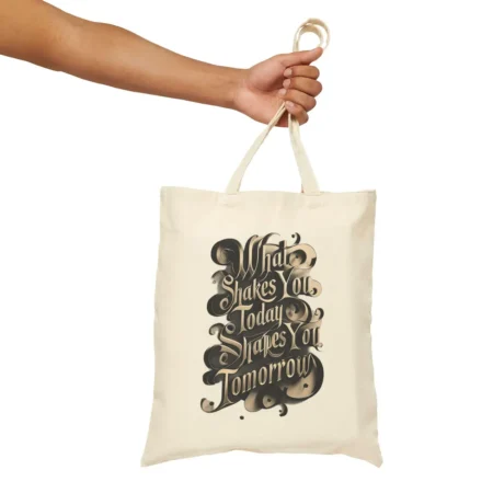 A durable and stylish Cotton Canvas Tote Bag featuring the empowering phrase ‘What shakes you today shapes you tomorrow’. Perfect for carrying groceries, books, or everyday essentials. Ideal for those who love motivational quotes and want to make a fashion statement while being eco-friendly. Great for gifting on birthdays, graduations, and as a back-to-school essential.