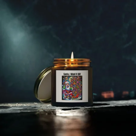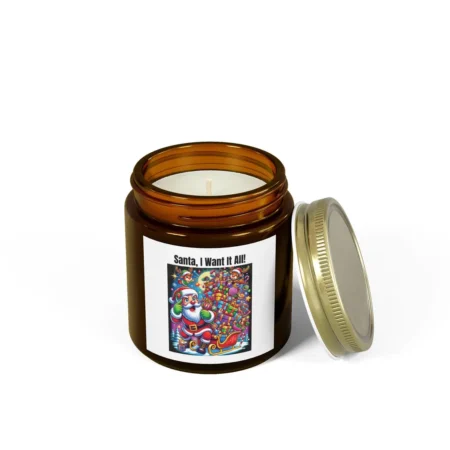 Scented Candles made with Coconut Apricot Wax, featuring the phrase ‘Santa, I want it all’. Perfect for Christmas decor and funny gifts. Creates a cozy and festive atmosphere, suitable for anyone looking to add a touch of holiday spirit to their home or office.