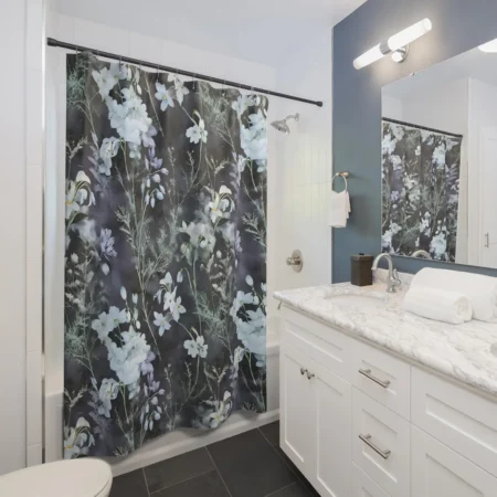 Enhance your bathroom decor with this Shower Curtains featuring a winter floral pattern on a dark charcoal background. Perfect for adding a touch of seasonal charm to your home.